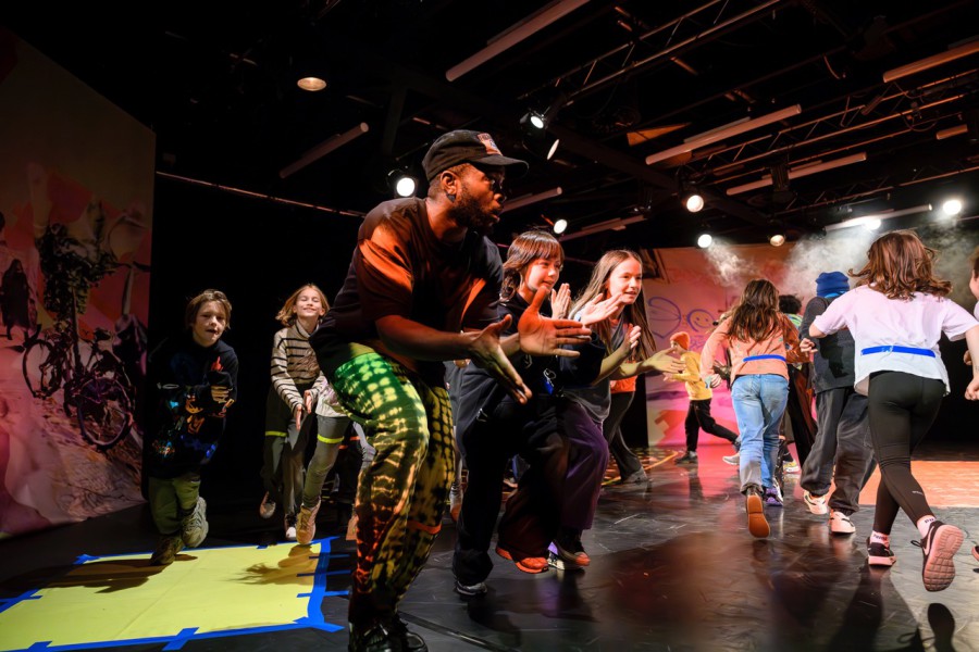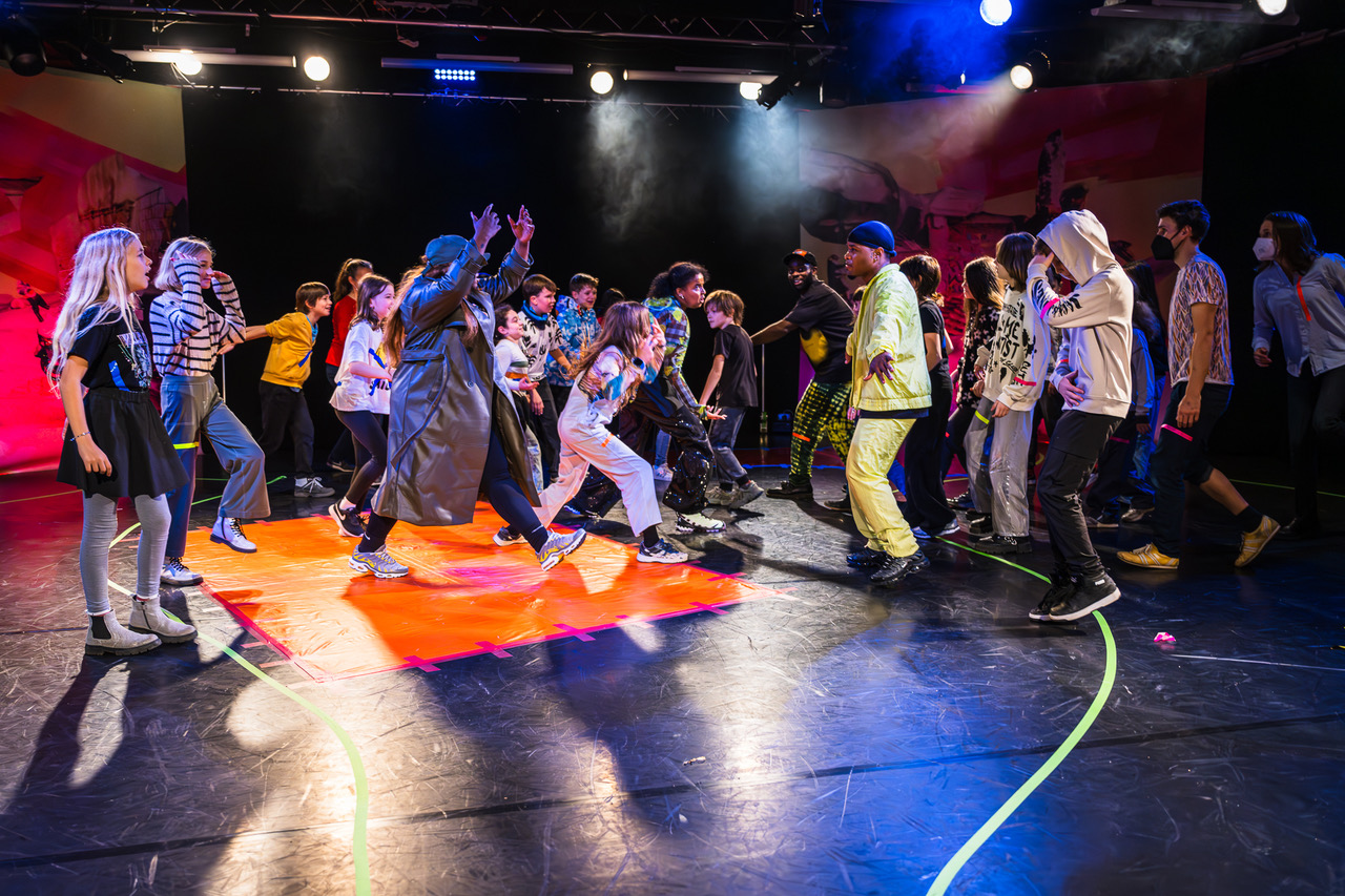 Es gab in dem Stück ein paar kleine süße Momente, an die ich mich immer wieder gerne erinnere. Generell war es toll zu sehen wie die Eltern und Kinder eine unbeschwerte Zeit hatten und man die klassische Rollenverteilung komplett vergaß. Die Eltern hatten Spaß und auch die Kinder. Natürlich habe sie auf die Kids geachtet, aber sie konnten sich selbst auch mal so richtig ausleben. Am Anfang des Stückes kam es zu einem Punkt, wo die Peformer*innen einen Kreis in der Mitte des Raumes bildeten. Am Anfang saßen sie zwischen uns und schauten uns aufmerksam an. Dann plötzlich kreuzte einer der Performer*innen die Kreismitte und dann der nächste. Das erste mutige Kind verstand es sofort und sprang auf und kreuzte auch. Zu meiner Überraschung begannen dann auch die Erwachsenen zu kreuzen und es entstand ein kleines Wirwarr. Ein kleines sortiertes Chaos. Mein kleiner Glücksmoment!