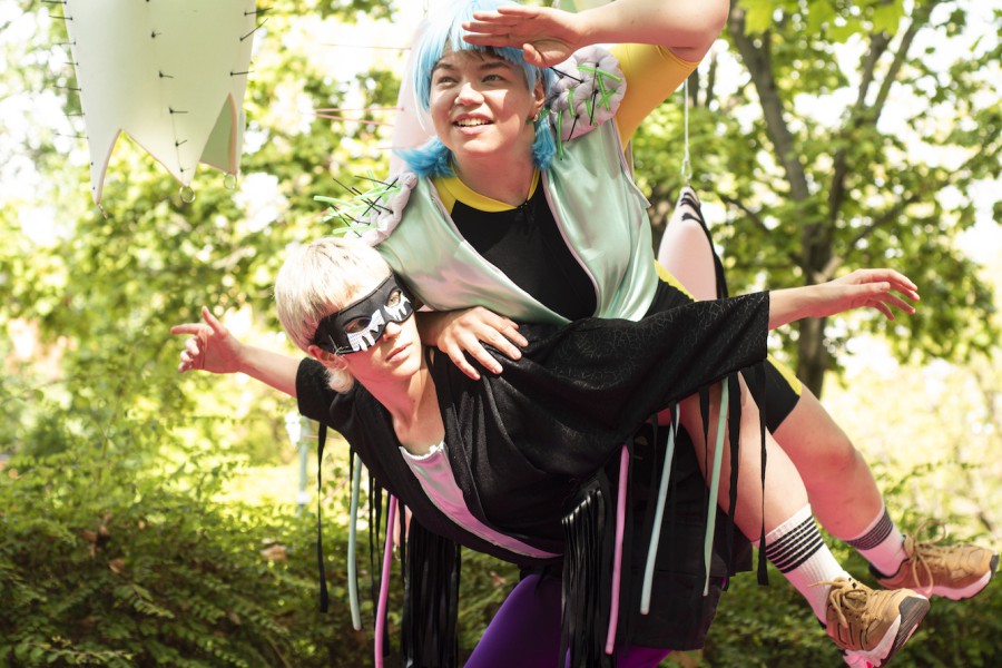 In einem alternativen Universum mit Traubensaftseen, Blaubeerbergen, einer Zitronensonne und magischen Kreaturen befragen die beiden Performer:innen Tasha und Eevi die Bilder von Stärke und Superkraft, mit denen Kinder aufwachsen. Gemeinsam mit den Designer:innen Katri und Helene erschaffen sie auf dem Apfelsinenplatz in der Gropiusstadt eine Fantasiewelt voller Objekte, Farben und Sounds. Unter dem Motto "Queering the Superhero" stellen sie mit den Figuren Elastrix und Stromax vielschichtige queere Identitäten dar. Sie kümmern sich um die Galaxie und lernen auf dem Weg dorthin, sich gegenseitig durch die Luft zu fliegen.