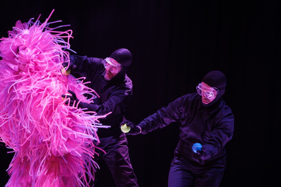 Eine Sache möchte ich noch extra betonen. Ich fand es großartig, wie die Techniker*innen auch ein Teil der Performance waren und nicht nur schmückendes Beiwerk, wie es leider oft ist. Das Gespann aus Performer*innen und Techniker*innen waren so rund wie mein Schneemann am Anfang des Stückes. Besondere Momente gab es, weil die Techniker*innen zwischen den Experimenten die Bühne vor unseren Augen umgeräumt haben wie z.B. die Lichtstäbe in eine andere Position gerückt haben und somit die Bühne ganz anders erschien. Ein weiterer spannender Moment war, als einer der Techniker*innen mit einer Gitarre Teil der Show wurde und live für uns gespielt hat und damit die Performer*innen unterstützt hat in deren Experiment. Sie haben somit nicht nur die Musik an den Geräten bedient, sondern auch hautnah Musik für uns gemacht. Jeder hatte damit seinen kleinen goldenen Moment und alle waren gleichberechtigt. Es verschwamm damit die klassischen Rollen Performer*innen und Techniker*innen. Sie waren eine Gemeinschaft, die gemeinsam stark war.