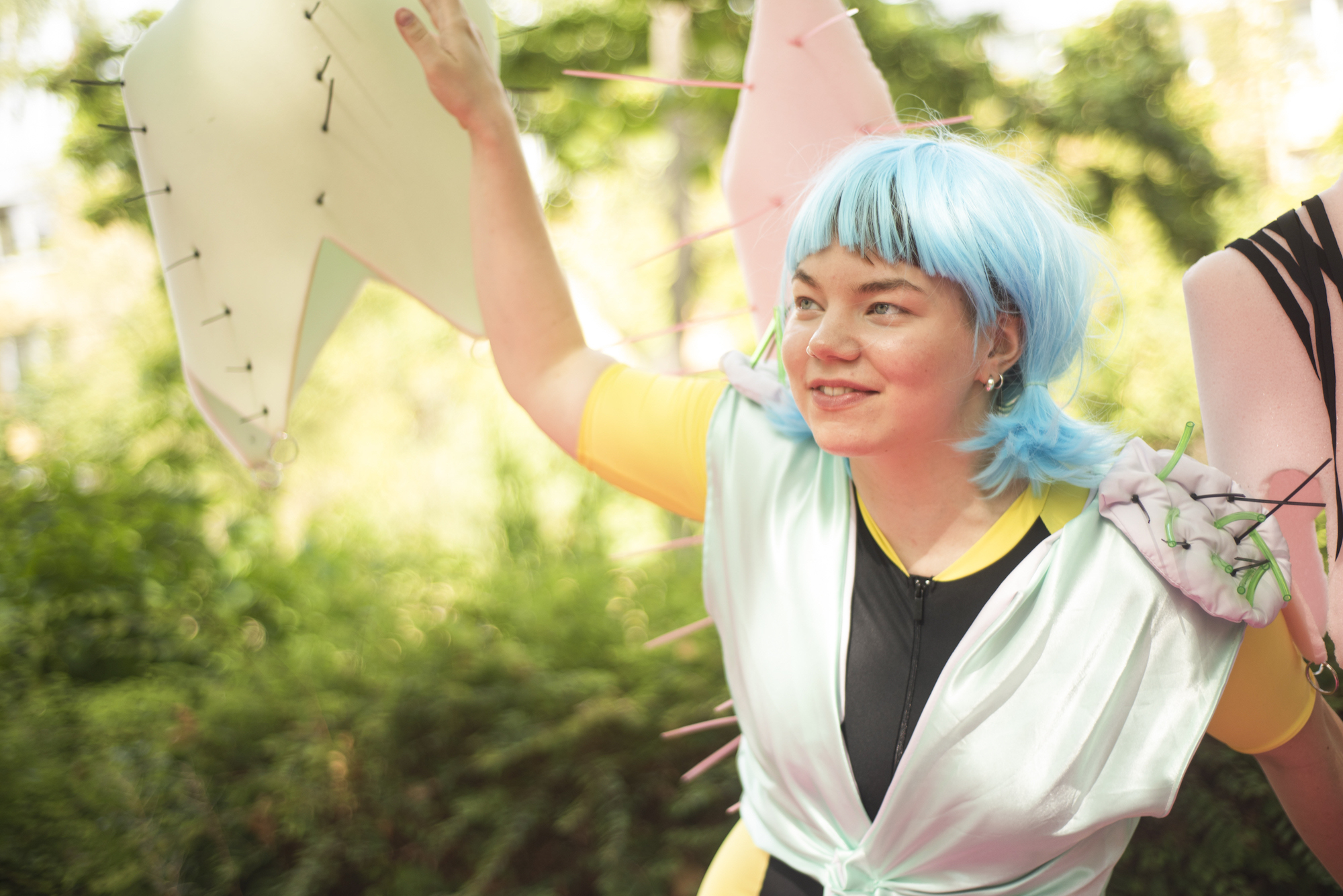 In einem alternativen Universum mit Traubensaftseen, Blaubeerbergen, einer Zitronensonne und magischen Kreaturen befragen die beiden Performer:innen Tasha und Eevi die Bilder von Stärke und Superkraft, mit denen Kinder aufwachsen. Gemeinsam mit den Designer:innen Katri und Helene erschaffen sie auf dem Apfelsinenplatz in der Gropiusstadt eine Fantasiewelt voller Objekte, Farben und Sounds. Unter dem Motto "Queering the Superhero" stellen sie mit den Figuren Elastrix und Stromax vielschichtige queere Identitäten dar. Sie kümmern sich um die Galaxie und lernen auf dem Weg dorthin, sich gegenseitig durch die Luft zu fliegen.