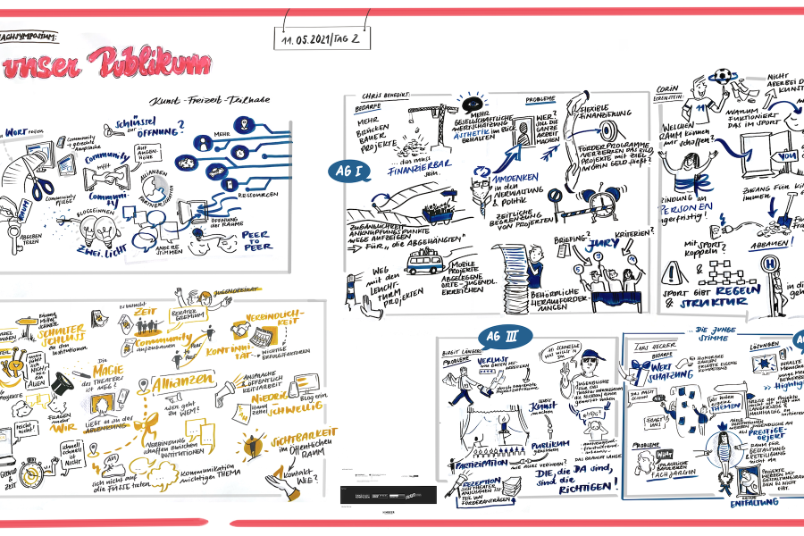 Im Mai 2021 fand unser dreitägiges Fachsymposium zum Thema „Wer ist unser Publikum?“ statt. Beteiligt waren zahlreiche Expert:innen aus den Bereichen (performativer) Kunst, Kultur und Medien, die gemeinsam der Frage nachgingen, über welche Kanäle und mit welchen Mitteln ein junges Publikum heute am besten erreicht werden kann. Involviert waren zudem mehrere Jugendliche, die den Beiträgen der Expert:innen folgten und mit ihrer Meinung am Ende eine kritische Reflexion ermöglichten. Die freie Tanzjournalistin Christine Matschke hat für die Offensive Tanz die Ergebnisse zusammengefasst. Die Grafikdesignerin Liane S. Hoder verwandelte die Ergebnisse der drei Tage darüber hinaus in anschauliche und informative Illustrationen. Der hier wiedergegebene Text stellt lediglich Auszüge dar, die Langversion kann am Ende des Beitrages zusammen mit weiterem Dokumentationsmaterial heruntergeladen werden.